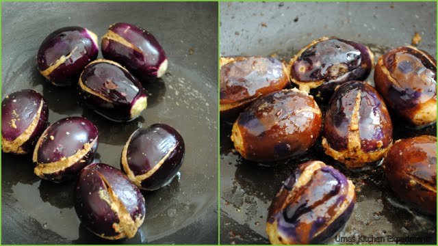 7) Now, Take a pan and heat the remaining oil. When they are hot and not smoking, add eggplants and fry till they are soft and half cooked. Transfer them to a plate.