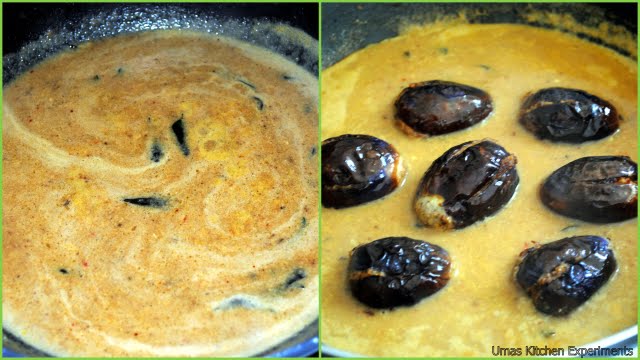 10) Wait for the gravy to boil. when it starts boiling, add oil fried eggplants.