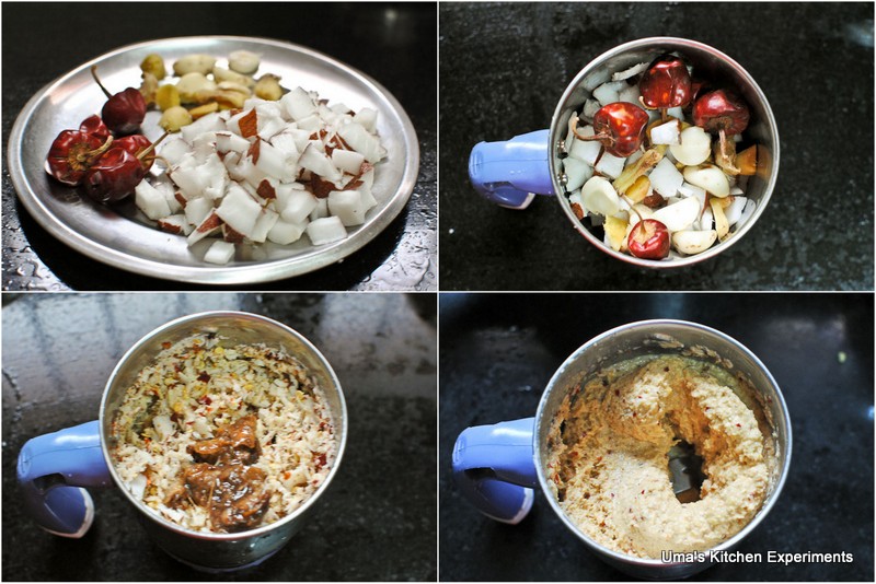 2) Put coconut, ginger, garlic and dry red chilli in a mixer/blender. After a second, add soaked tamarind along with water. Make a fine coarse paste of it.
