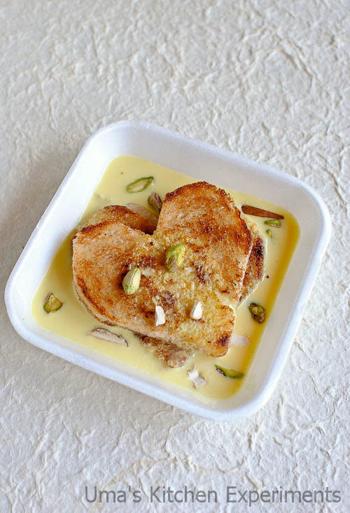 3) I used 1/2 cup of sugar and I had left over sugar syrup. Added this to the rabri and stored in refrigerator. Before serving, Placed the sugar syrup coated bread slices in the serving plate and poured the rabri. Decorated it with chopped nuts.