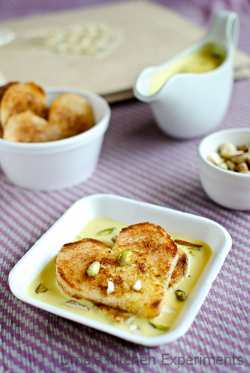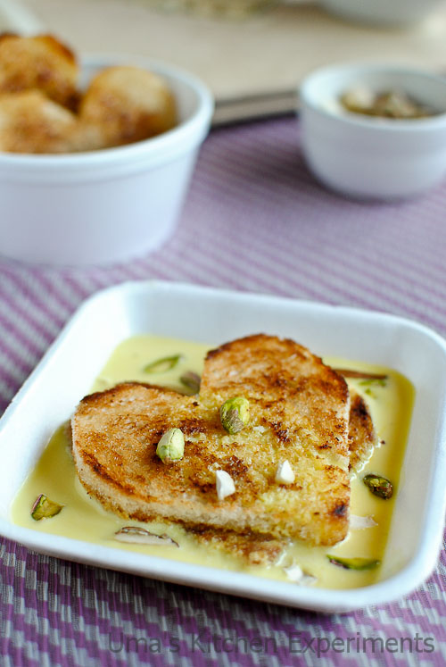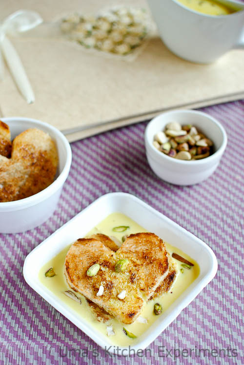 Last week, One of my friends pinged me and said that she prepared shahi turka and tagged me a photo of that in FB. She also said it turned out super good and tasty. Inspired(Tempted) by her photo, changed my mind from bread halwa to sahi tukra. By the time of preparing it, the idea of making heart shape came into my mind and what you see here is the final outcome. 🙂