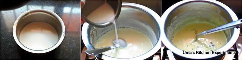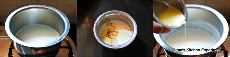 1) Heat milk in the heavy bottom, deep pan. When it reaches warm temperature, take one or two ladle of milk to a small bowl and add saffron to it. Let it sit till the milk completely boils.