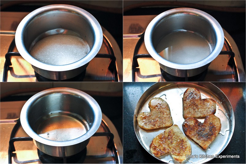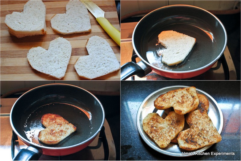 4) Meanwhile, cut the bread slices into your desired shapes and shallow fry it in a pan or tawa. I cut the bread slices into heart shape. Applied butter both the sides and shallow fried it.