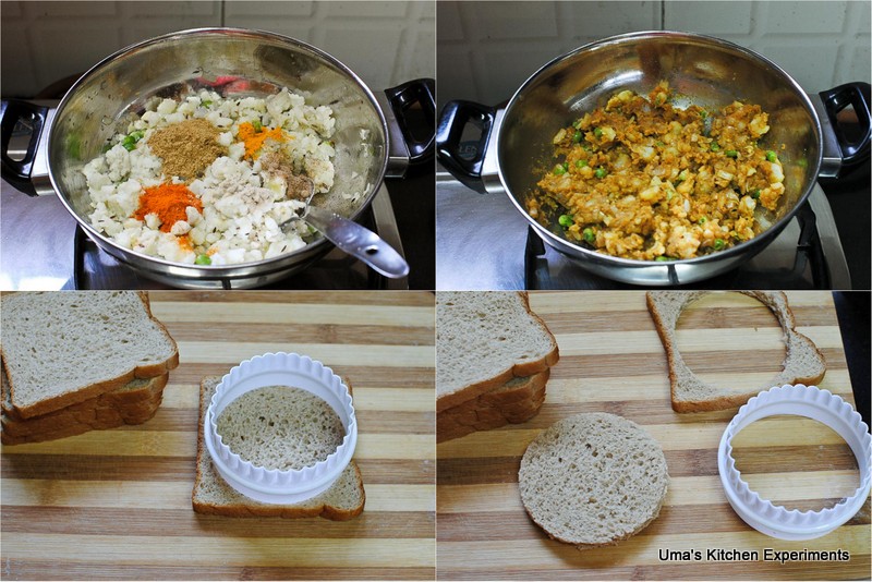 9) Now, take the bread slices. Cut the crust out of it. If you have a cookie cutter cut into a round shape. Also, save the crust. I will be sharing a recipe using the crust soon.