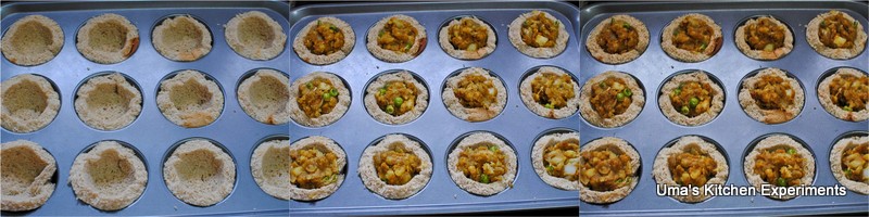 10) Place the shaped bread slices in the muffin tray as shown in the picture. This forms the cup shape. Make sure not to break the bread slices.
