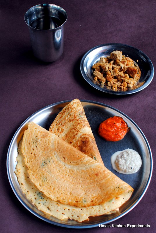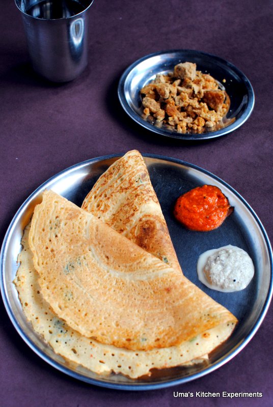 As this dosa doesn’t require fermentation, I thought of preparing it for breakfast. I soaked all the ingredients. After 3 hours of soaking, I grind the ingredients and prepared a crispy thin dosa with assortments (tomato kara chutney and coconut chutney) to go with. It is most often served with avial with a dollop of butter. If nothing worked out, a simple jaggery will give good pair with this dosa.