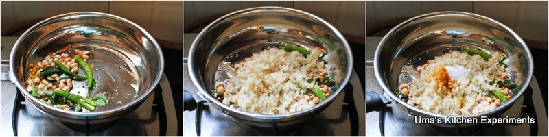 2) Add curry leaves, channa dal, roasted peanuts, asafoetida, slit green chillies. Fry till the channa dal becomes golden brown colour.