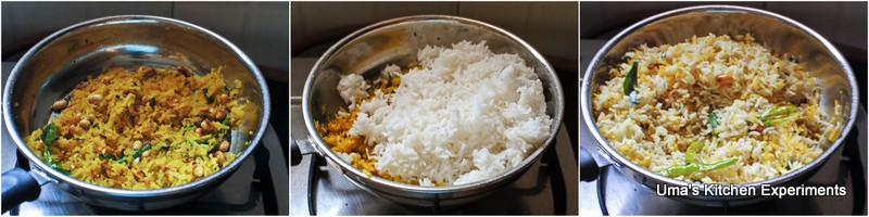 4) Give a very good toss. When the raw smell of turmeric goes away, add the cooked rice and gently mix it. Lower the flame to avoid burning.