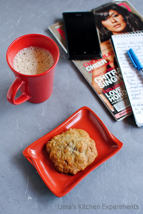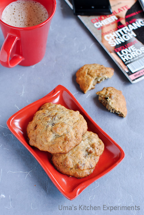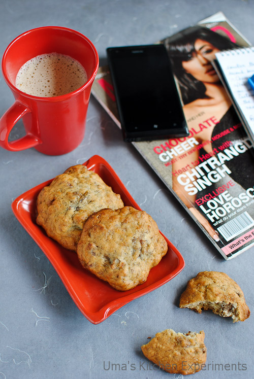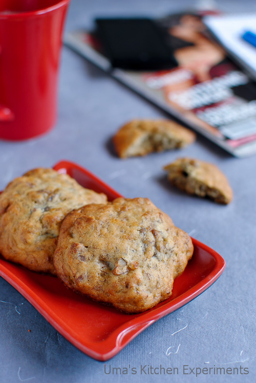 I looked into my ‘to-do’ recipes list and found these cookies recipe which works out well with the ripe bananas. The cookies were over in no time as they tasted fabulous. These cake-like textured cookies became an instant hit at home.