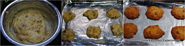 8) Drop as dollops onto the baking tray with even intervals. Bake it in the preheated oven for 10-13 minutes or until the cookies turn golden brown.