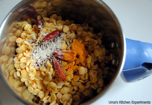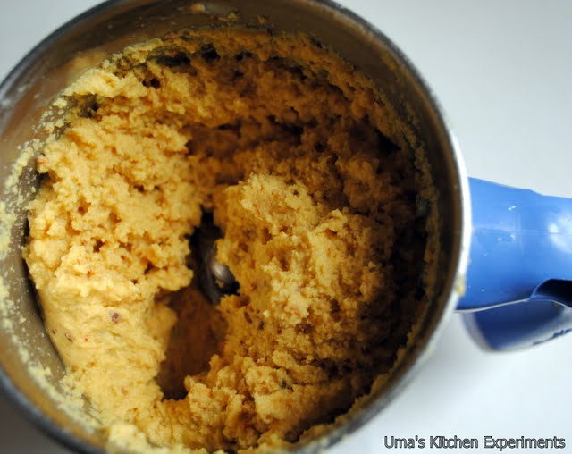 2) Soak the toor dal in water minimun for 2 hours. After 2 hours drain the water from toor Dal and grind it coarsely with cumin seeds, 3 red chillies, turmeric powder, a pinch of salt and asafoetida. Don’t add water. The moisture in the dal is enough.
