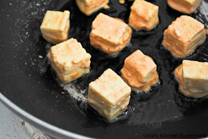 4) Heat oil in a wide pan. Once it is hot, shallow fry the paneer until its skin turn golden brown. You can also deep fry paneer or bake it in a preheated oven for 200C for 15-20 minutes or until paneer turns golden brown.