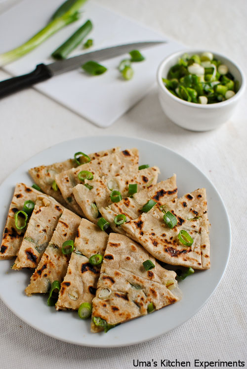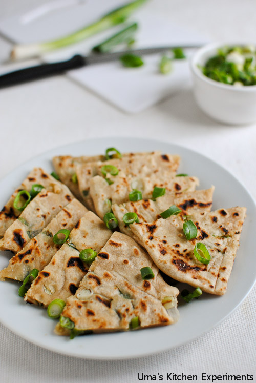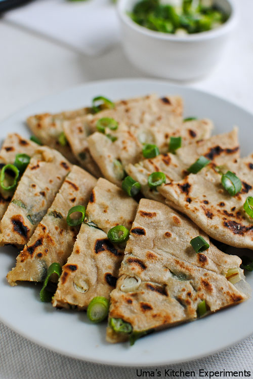 Whenever I visit Indian shops, I find these scallion pancakes in the frozen section. Once, I bought them along with flaky paratha(which I used for making vegetable kothu paratto) and found the procedure for making it is almost similar to flaky paratha.