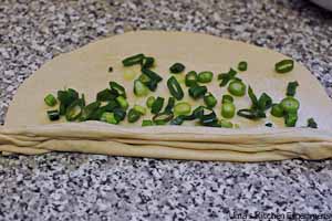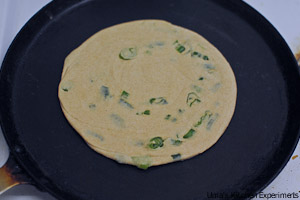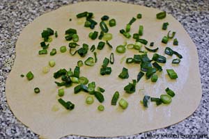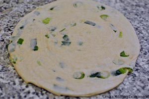 6) Sprinkle a tablespoon of spring onion in the oiled surface.