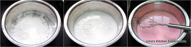 3) In a mixing bowl, mix corn flour, food colour and 1 and 1/2 cup of water. Stir well till you don’t see any lumps. Keep aside.