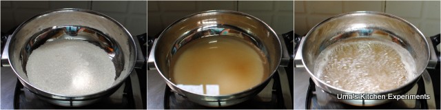 4) In a heavy bottom pan or kadai, take sugar. Add a cup of water. Allow it to boil and wait till the sugar completely dissolves and become slightly thick. No need to check for any string consistency.