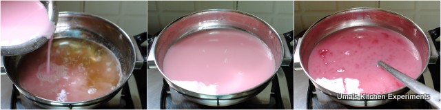 6) When you stirring, as an initial step of thickening, it forms a lumpy,glossy texture here and there. Keep on stirring it until it turns thick and changes in its colour.