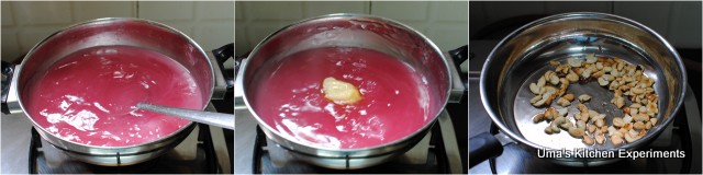 1) In a frying pan, add 1/2 tablespoon of ghee and fry the roughly chopped cashew nuts. Transfer it to a plate and keep it aside.