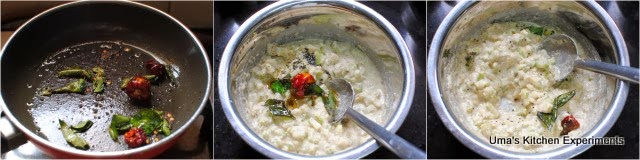 6) Heat oil in another pan and add mustard seeds to splutter. Add curry leaves, red chilli and asafoetida. Let it become crisp. Pour this seasoning to the cucumber gojju.