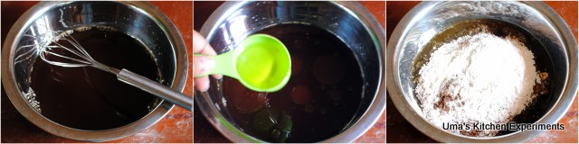 2) In a large mixing bowl, take the brewed coffee. Add vinegar, vanilla extract and olive oil. Mix well.