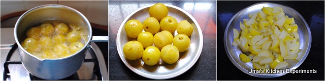 1) Heat water along with a pinch of salt and turmeric in a sauce pan. When it is boiling, add amla slowly. Let it be in rolling boil for 5 minutes. Turn the flame off. Drain the water and allow the amla to cool.