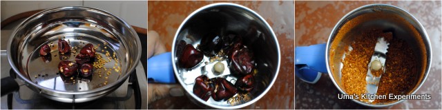 2) Meanwhile, dry roast red chilli and fenugreek seeds. Make a powder of it. Keep it aside.