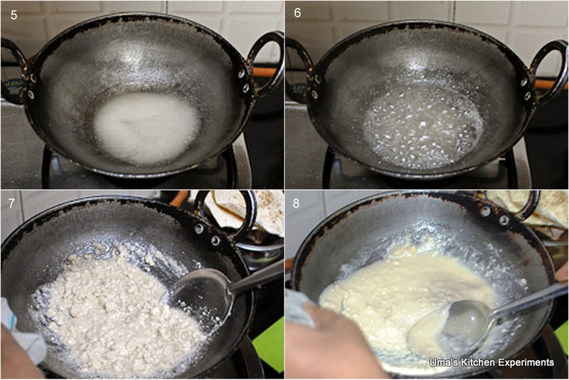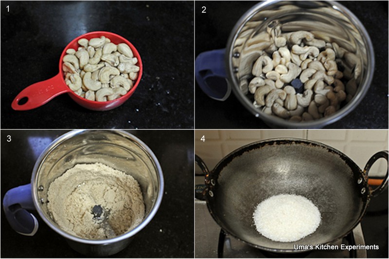 1) Put Cashew nuts in a mixer/coffee maker and make a fine powder of it. Do it in a single stretch to avoid the cashews sticking with mixie jar. Also, take care not to grind too much as it releases oil most of the time while over grinding.