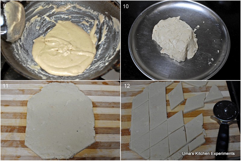5) Keep stirring to avoid lumps and until the dough comes out from the sides of the pan. You can also pinch and try making a small ball. If you are able to do so, then it is in correct consistency and ready to transfer to a ghee coated plate. My dough required little kneading. So, I kneaded it in a plate and rolled it in my cutting board.