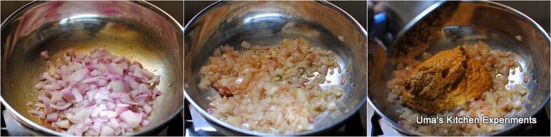 3) Add the ground paste. Mix well. Use little quantity of water to rinse the mixie jar and pour it to the pan. Saute and let it cook for 3 minutes.