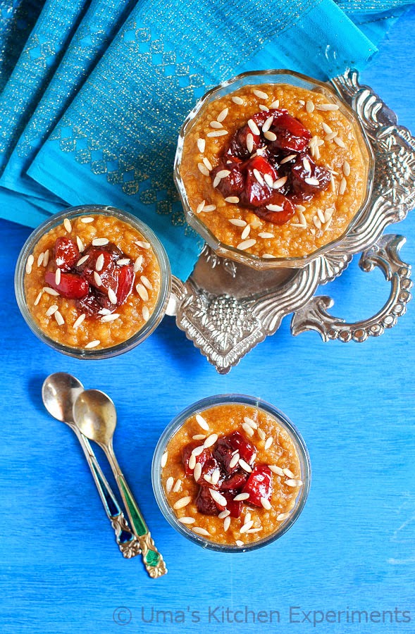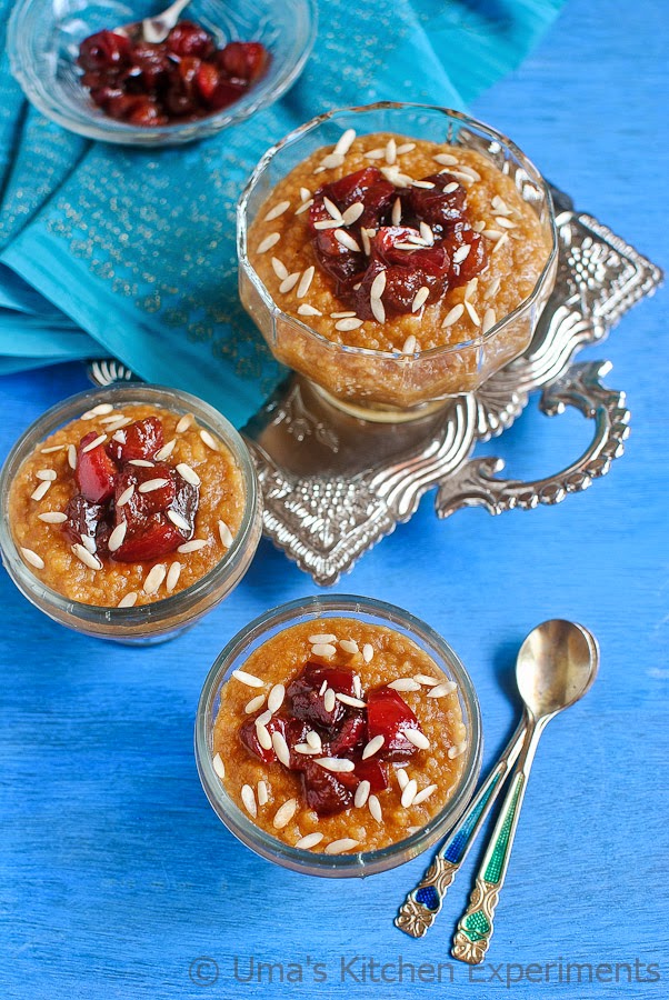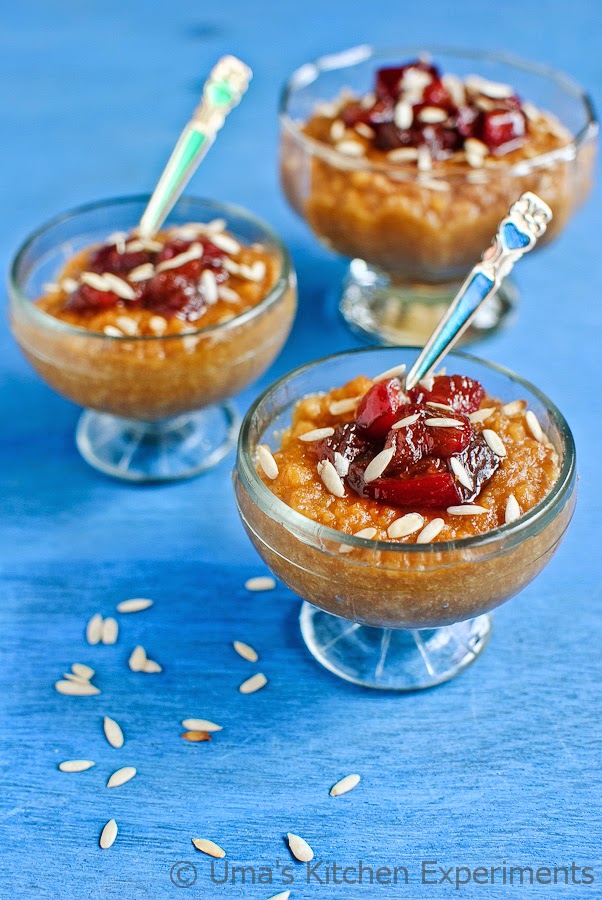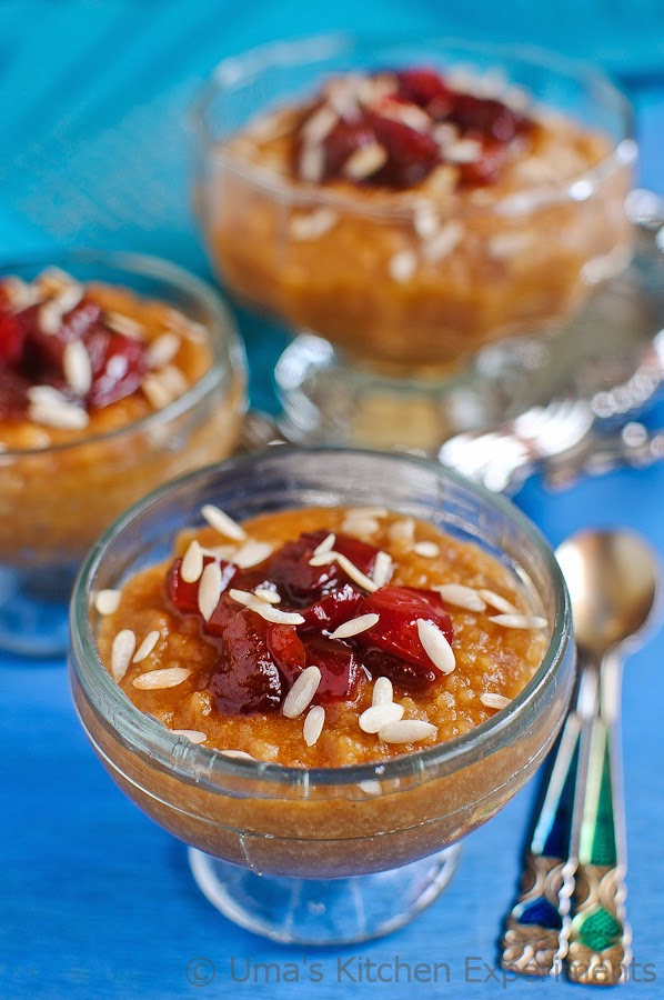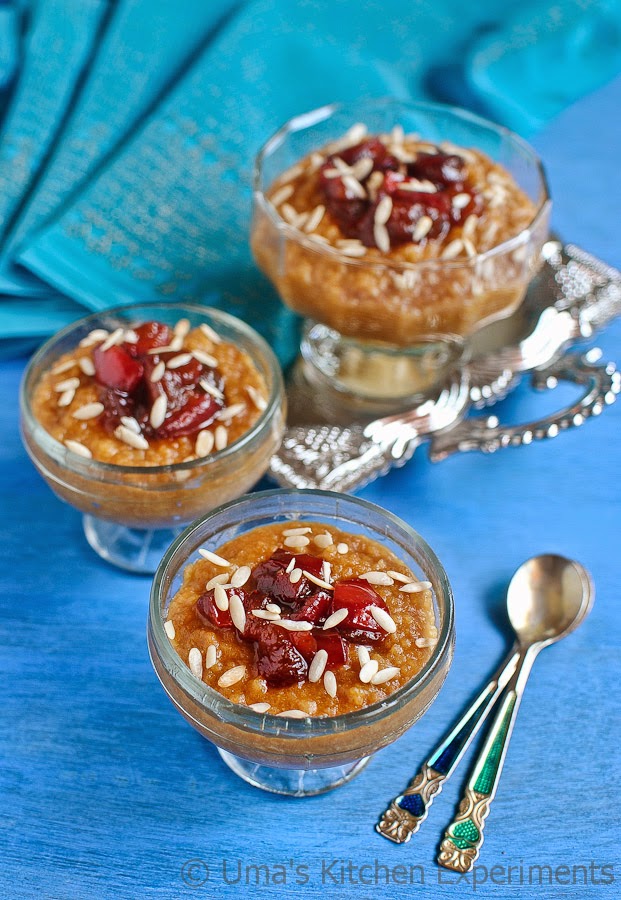 After I made this pudding, just before assembling, my father-in-law came to kitchen. Seeing me working on some dish, asked me whether it is a sweet pongal. Not a bad guess though. It looked like sweet pongal and it can be a sweet pongal if you add some split yellow moong dal, lots of ghee, cardamom and roasted nuts.