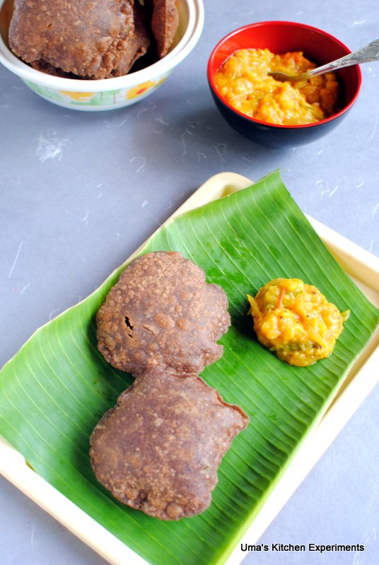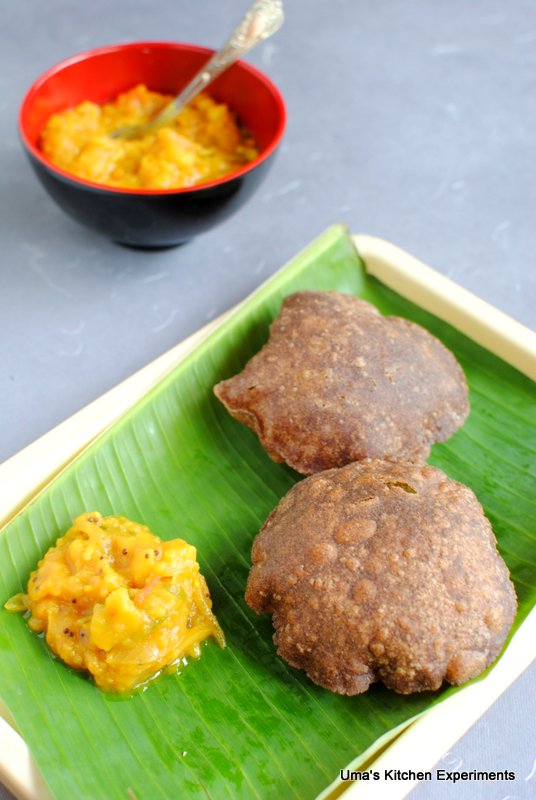I usually prepare Ragi Sankatti, Ragi buttermilk and Ragi pakoda using ragi flour. All of them are yet to come from my kitchen to on line. This time, for a change I prepared Ragi poori for a change. The reason is very simple. I found the opened pack of ragi flour untouched, when I cleaned my pantry last time. As It was in very small quantity(only one cup), I added it with wheat flour and prepared poories/puries. Most of the poories/puries were puffed up well but you have to put some extra care/effort while rolling the poories/puries. I used more flour for dusting to roll perfect poories/puries.