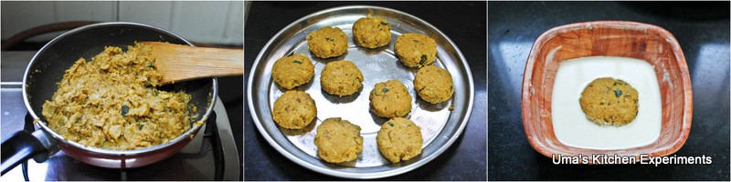 8) Continue cooking till the mixture looks thick and water free. Allow it to cool for a while and make round patties out that. Arrange them in a plate.