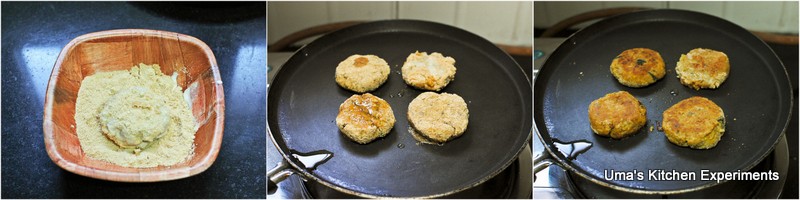 11) Heat tawa/pan. When it is hot, dip the patties into the flour mixture one by one to make a coating and then make a coating of bread crumbs.