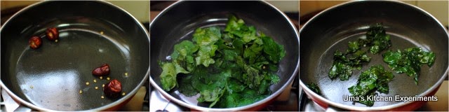 3) Once done, add 2 teaspoons of oil and add thoothuvalai leaves. Saute till it shrinks in its size and leaves nice aroma. Transfer to a plate.