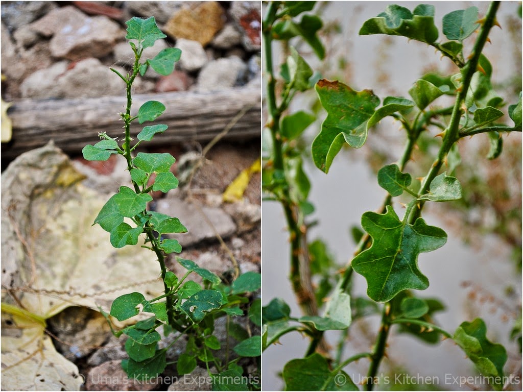 1) Pick young leaves of thoothuvalai which are free from thorns. After cleaning it properly, you can use it directly in any recipe. If you get the matured leaves, you need to carefully scrape down the thorns from the front and back side of it. Remove the stem from leaves.