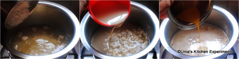 4) Reduce the flame to medium. Save some chopped nuts for garnishing and add the remaining dry fruits to the pan. Let it boil well. Keep an eye it might rollover.