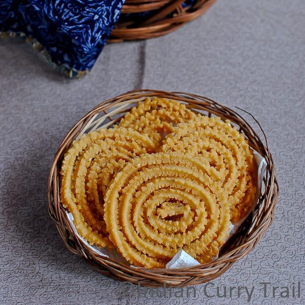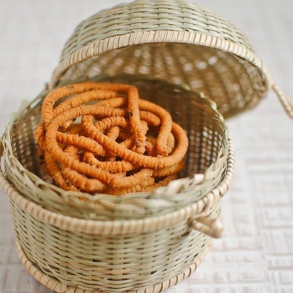 The word “Murukku” is derived from the Tamil language. It translates as twisted or coiled. Murukku preparation involves a special device known as “Murukku Maker”. This tool looks like a cookie press but is designed to make noodles out of dough and then it is twisted or coiled to make a random look-alike shape and then deep fried.