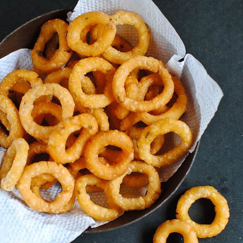 - Deep fry murukku in batches. I fried three at a time. Once the murukku appears firm, flip it using a perforated ladle. Do not turn it in early as they can break while doing so.